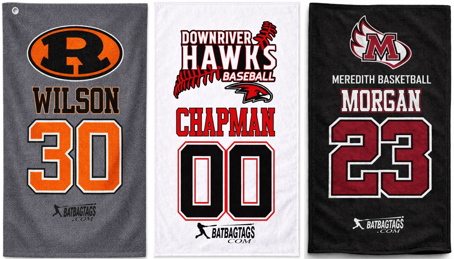 Full Color Custom Player Towel. Towel measures 11" x 18" and comes with grommet hook. Printed on one side only. Includes up to three colors with player name and number.